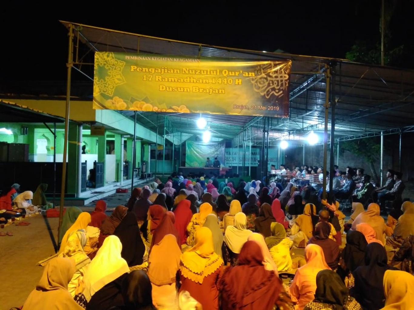 Wonokromoinfo - Takmir masjid Brajan bekerjasama dengan PKK dan Pemuda-pemudi Dusun Brajan mengadakan pengajian memperingati Nuzunul Qur'an 17 Romadhon 1440 H di Halaman Masjid Brajan Wonokromo PLeret Bantul pada Selasa malam (21/05/19).